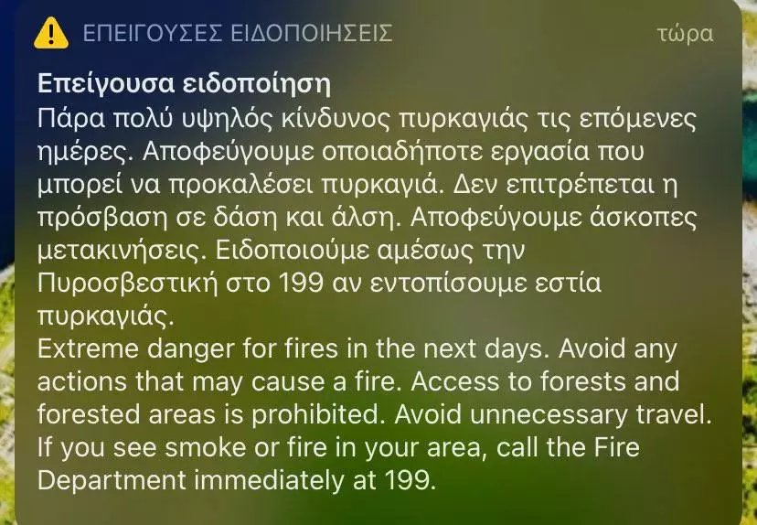 «Πολύ υψηλός κίνδυνος πυρκαγιάς τις επόμενες μέρες. Αποφεύγουμε οποιαδήποτε εργασία που μπορεί να προκαλέσει πυρκαγιά. Δεν επιτρέπεται η πρόσβαση σε δάση και άλση. Αποφεύγουμε άσκοπες μετακινήσεις. Ειδοποιούμε αμέσως την Πυροσβεστική στο 199 αν εντοπίσουμε εστία πυρκαγιάς» αναφέρει το μήνυμα.