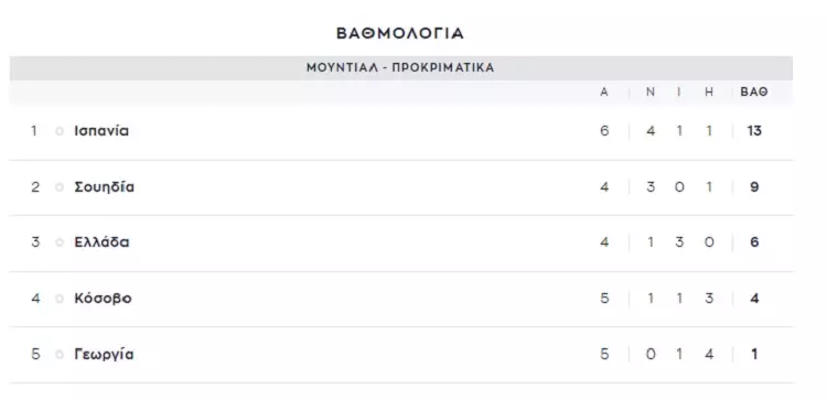 Η Ισπανία βρίσκεται στην κορυφή με 13 βαθμούς μετά και τη νίκη της απέναντι στο Κόσοβο στην Πρίστινα με 2-0 και είναι το αδιαφιλονίκητο φαβορί για απευθείας πρόκριση στο Παγκόσμιο Κύπελλο. Η Ελλάδα παραμένει αήττητη στον 2ο όμιλο έπειτα από τέσσερις αγώνες που έχει δώσει, αλλά οι δυο ισοπαλίες ήταν πολύ κακές με Γεωργία (1-1) και Κόσοβο (1-1).