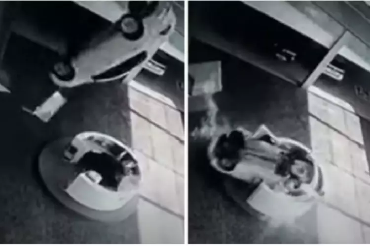 Την απίστευτη στιγμή που ένα αυτοκίνητο πέφτει από τον δεύτερο όροφο έκθεσης αυτοκινήτων στη ρεσεψιόν, όπου εκείνη την ώρα καθόταν νεαρή γυναίκα, κατέγραψε κάμερα ασφαλείας. Το όχημα σπάει τα και προσγειώνεται στη ρεσεψιονίστ τραυματίζοντάς την.