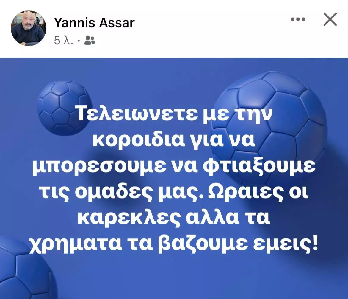Αναλυτικά έγραψε: «Τελειώνετε με την κοροϊδία για να μπορέσουμε να φτιάξουμε τις ομάδες μας. Ωραίες οι καρέκλες, αλλά τα χρήματα τα βάζουμε εμείς».
