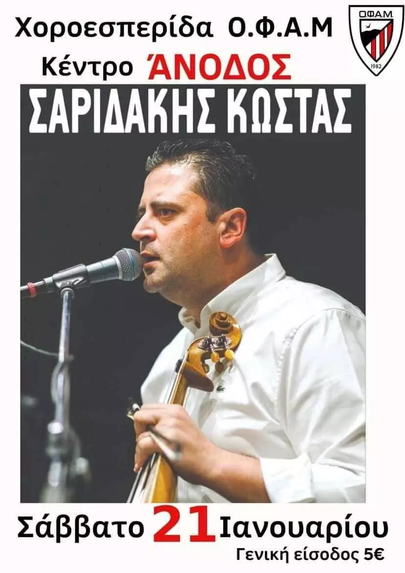 Συγκεκριμένα, το Σάββατο 21 Ιανουαρίου, στο κέντρο «Άνοδος» το σωματείο θα «χορέψει» με το συγκρότημα του ιδιαίτερα δημοφιλή και αγαπητού κρητικού καλλιτέχνη Κωστή Σαριδάκη, υποσχόμενοι άπαντες μια όμορφη βραδιά, γεμάτη διασκέδαση και πολύ χορό!