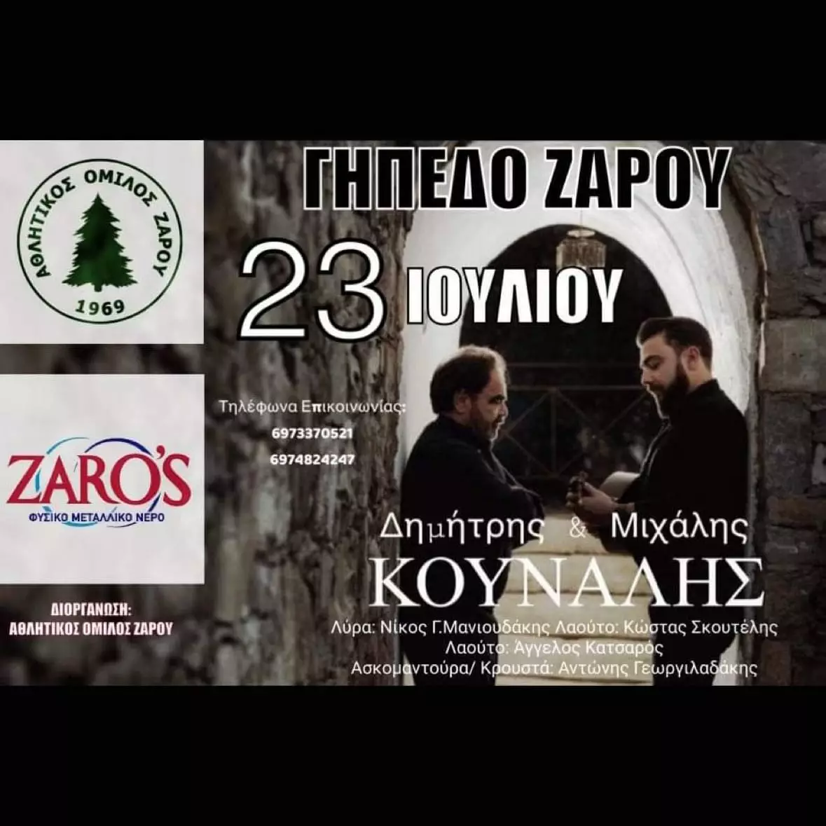Την Κυριακή 23 Ιουλίου στο γήπεδο του Ζαρού η ομώνυμη ομάδα διοργανώνει μεγάλο γλέντι, οπού θα τραγουδήσουν οι σπουδαίοι καλλιτέχνες, Δημήτρης και Μιχάλης Κουνάλης.