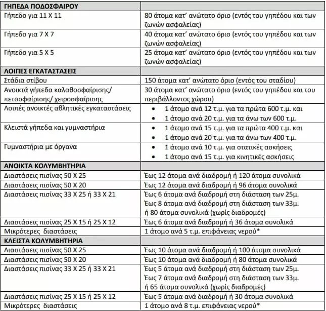 * Μειώνεται στο 75% ο μέγιστος αριθμός αθλουμένων ανά εγκατάσταση, σύμφωνα με τους Όρους Λειτουργίας Αθλητικών, Ναυταθλητικών Εγκαταστάσεων και Κολυμβητηρίων και τον σχετικό πίνακα με τον μέγιστο αριθμό αθλουμένων ανά εγκατάσταση (φωτό).